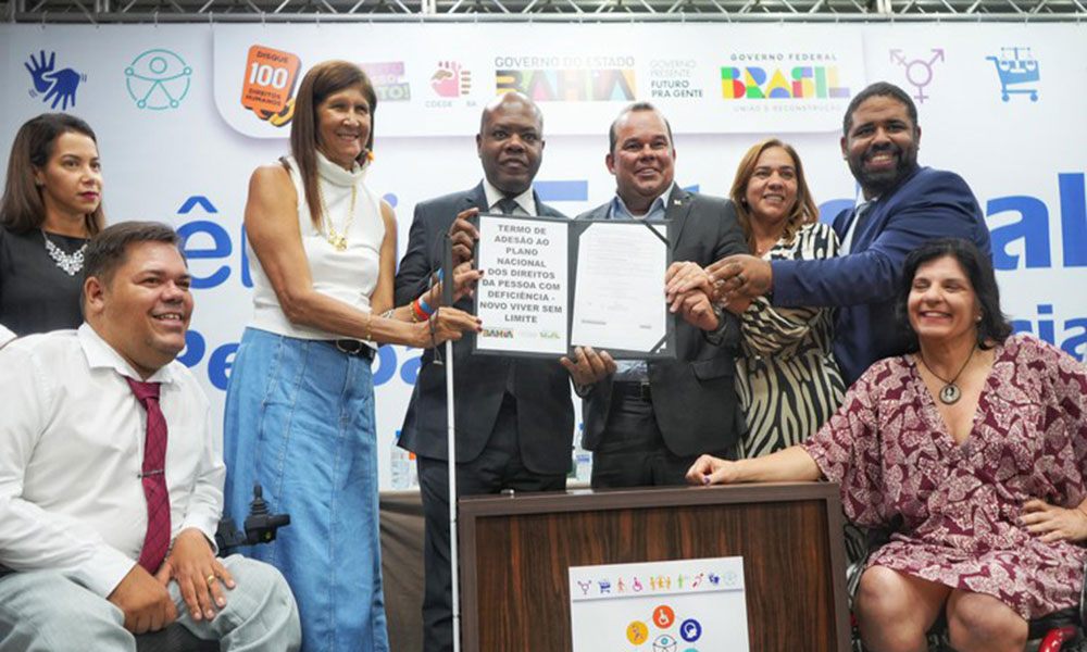 Investimentos de R$ 6,5 bilhões – e cerca de 100 ações – marcam o Novo Viver sem Limite que, a partir desta terça-feira (23), conta com a adesão do estado da Bahia. O ministro dos Direitos e da Cidadania (MDHC), Silvio Almeida, e o vice-governador, Geraldo Júnior, estiveram na solenidade de formalização da parceria. O plano é uma iniciativa do governo federal e propõe um Brasil mais inclusivo e igualitário, com proteção e promoção dos direitos das pessoas com deficiência do país. Durante o evento, o ministro Silvio Almeida deu destaque ao compromisso inadiável para com os direitos das pessoas com deficiência. “Que esse momento da assinatura do Novo Viver sem Limite seja mais um capítulo na formação do país que nós queremos viver. Falar de direitos humanos é falar de um mundo em que as pessoas podem ser a melhor versão de si mesmas. É o mundo que dá as condições para que as pessoas possam ser aquilo que podem ser de melhor”, celebrou, ao refletir sobre o tema da conferência, “Cenário atual e futuro na implementação dos direitos das Pessoas com Deficiência: construindo um Brasil mais inclusivo”. Secretária nacional dos Direitos da Pessoa com Deficiência do MDHC, Anna Paula Feminella chamou atenção para a importância da assinatura justamente durante a 5ª Conferência Estadual dos Direitos da Pessoa com Deficiência da Bahia, que conta com ampla participação de representantes da sociedade civil. “O sucesso da participação social é também o sucesso da construção e da consolidação de um país mais justo e democrático. Desejo que a gente viva um mundo sem limites, coletiva e solidariamente, como uma comunidade interdependente e que todos se apoiam. Porque é conosco, e não sem nós, que a roda da história há de girar”, declarou Feminella. Para o vice-governador da Bahia, Geraldo Júnior, o momento é de reflexão e de estreitamento da relação com o governo federal, além de ampliar as políticas de inclusão social. “Hoje, aqui, é um exemplo do reforço da cidadania, da acessibilidade e, acima de tudo, do respeito aos direitos das pessoas com deficiência. Hoje estamos celebrando mais uma página dessa história”, completou. Entre as autoridades, também estiveram presentes o secretário de Justiça e Direitos Humanos da Bahia, Felipe Freitas; o presidente do Conselho Estadual da Pessoa com Deficiência (Coede), Sidney Reis; e a representante da Associação Baiana para Cultura e Inclusão (Abaci), Cristina Gonçalves.