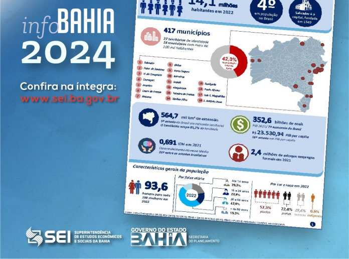 A Superintendência de Estudos Econômicos e Sociais da Bahia (SEI) apresenta à sociedade o Info Bahia 2024. O trabalho apresenta anualmente, de forma acessível, infográficos que sintetizam os principais dados e informações sobre o estado. Os dados mais atuais apontam que, em 2022, a população da Bahia somava 14,1 milhões de habitantes. Quase metade dessa população se concentrava em 18 municípios do estado, mesmo com uma extensão territorial de 564,7 mil km². A população da Bahia é constituída majoritariamente por mulheres (93,6 homens para cada 100 mulheres), indivíduos em idade adulta (42,0% tem entre 30 e 59 anos, independente do sexo) e negros (pardos são 57,3% e pretos 22,4% da população total). Este compêndio de dados socioeconômicos do estado é feito desde 2018 com a finalidade de apresentar um panorama da Bahia de fácil visualização para o público em geral. As principais fontes de dados são as bases do Instituto Brasileiro de Geografia e Estatística (IBGE), como o Censo Demográfico de 2022 e a Pesquisa Nacional por Amostra de Domicílios Contínua (PNAD-C), além da base do Produto Interno Bruto (PIB) municipal e estadual, uma parceria entre a SEI e o IBGE. As informações são apresentadas em quatro dimensões: demografia; economia; comércio exterior e mercado de trabalho. Em termos de geração de riqueza, em 2021, o PIB da Bahia foi de R$ 352,6 bilhões (7ª economia do Brasil), o que equivalia a 3,9% do PIB nacional e 28,4% do PIB da Região Nordeste. Toda essa riqueza gerada estava dividida em diferentes participações entre os três grandes setores econômicos: Agropecuária (11,1% do PIB total), Indústria (24,9%) e Comércio e Serviços (64,0%). Entre as atividades em destaque, por grandes setores, estão: produção de grãos no oeste baiano (soja equivale a 5,0% da produção nacional; algodão, 22,0% da produção nacional; milho, 2,3% da produção nacional); a indústria de transformação no entorno da Região Metropolitana de Salvador (refino de petróleo, 6,4% da produção nacional; produtos químicos, 9,2% da produção nacional); e comércio – pulverizado entre os municípios do estado. Entre as exportações, a Bahia é o 10º estado em valor exportado. Em 2023, foram 11,3 bilhões de dólares em valor exportado. Isso equivalia a 3,3% das exportações nacionais e 45,4% das exportações da Região Nordeste. Os principais segmentos exportados pela Bahia são: soja – US$ 3,1 bilhões; petróleo e derivados – US$ 2,4 bilhões; papel e celulose – US$ 1,2 bilhão. E entre os principais destinos estão: China (28,4% em valor exportado), Singapura (11,4%) e Estados Unidos (7,7%).