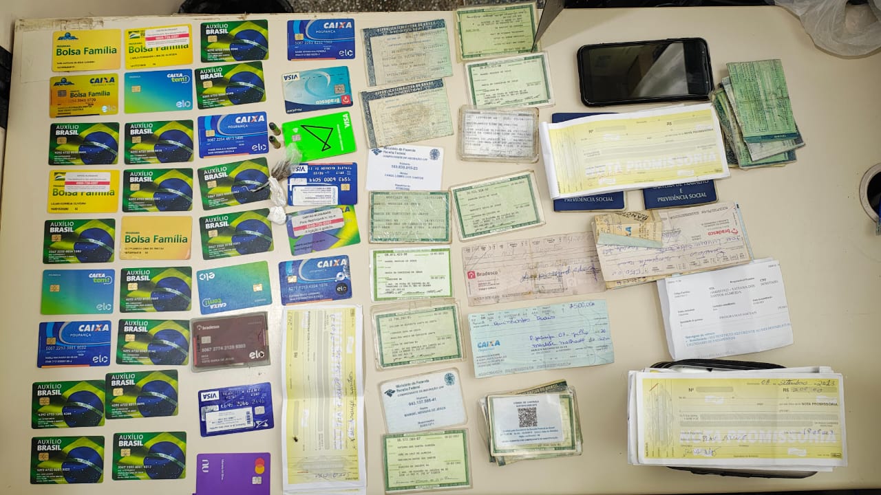 Um homem investigado por extorsão foi preso por equipes da Delegacia Territorial (DT) de Riachão do Jacuípe, na quinta-feira (23), no bairro Bela Vista. Dezenas de cartões bancários e de saque de benefícios do governo, além de diversas carteiras de identidade de terceiros foram apreendidos com o suspeito, durante cumprimento de mandado de busca e apreensão. De acordo com o delegado Danilo de Andrade Ribeiro, o homem também é investigado pelos crimes de ameaça e usura. “Apuramos que ele emprestava dinheiro e cobrava juros abusivos, além de reter o documento das vítimas. Algumas delas eram extorquidas mediante violência e grave ameaça”, explicou. Duas porções de cocaína e uma ‘trouxinha’ de maconha também foram apreendidas com o suspeito, que já tem passagem por posse ilegal de arma de fogo. Um Termo Circunstanciado de Ocorrência (TCO) por posse de droga foi lavrado contra o investigado. O material apreendido será periciado. Equipes da 15ª Coordenadoria Regional de Polícia do Interior (Coorpin/Serrinha) e das Delegacias Territoriais de Valente e Conceição do Coité deram apoio no cumprimento das ordens judiciais.